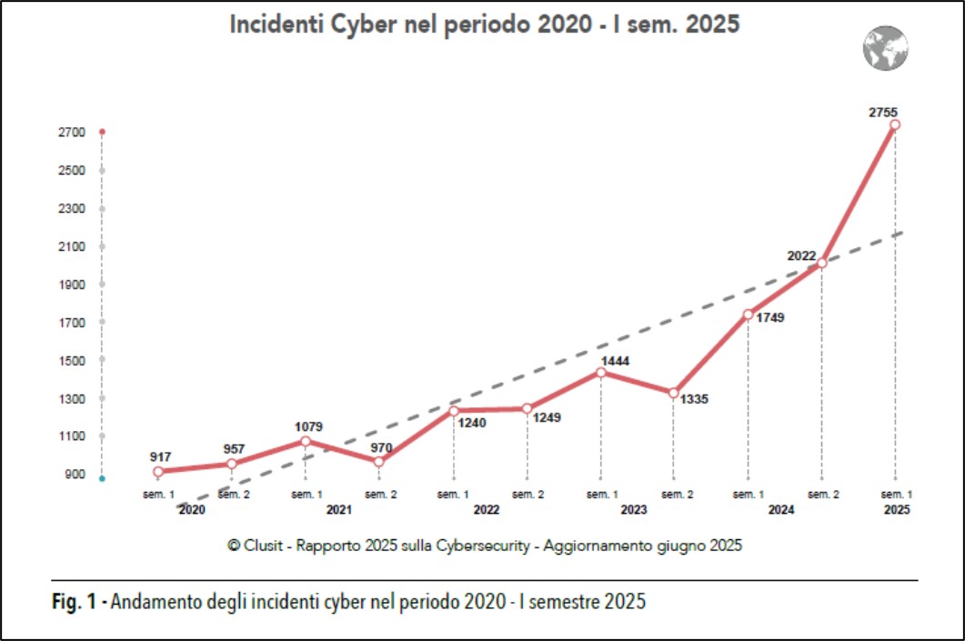 Nei primi 6 mesi del 2025, gli attacchi avvenuti con successo contro le Organizzazioni del nostro Paese costituiscono il 10% del totale degli eventi rilevanti a livello mondiale.